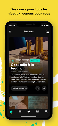 De l'histoire des cocktails et des spiritueux, aux recettes de vos cocktails préférés et à l'amélioration de vos compétences en gestion de bar, vous découvrirez dans nos cours tout ce dont vous avez besoin pour améliorer vos compétences de barman. Nous développons des méthodes d'apprentissage interactives et nos cours comprennent sont faits à la fois de contenus écrits, d’audio, de vidéos et d’infographies. Après avoir terminé le quiz à la fin d’une leçon, vous aurez accès à la leçon suivante.