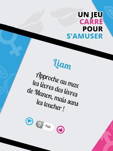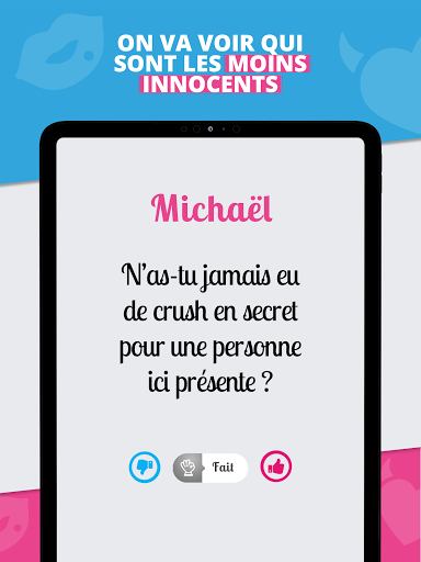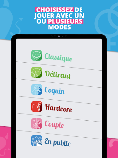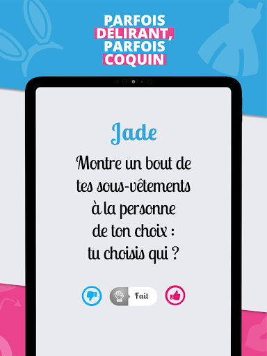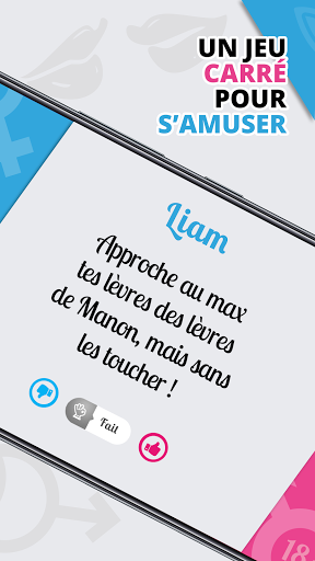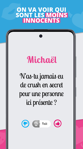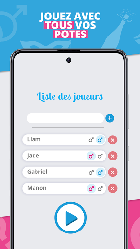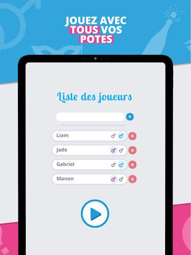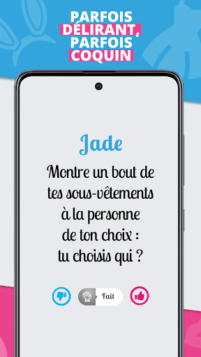 En tant qu'habitués des soirées, vous savez qu'il est parfois difficile de mettre de l'ambiance ou de mettre certaines personnes dans le bain. Jouer à nos jeux coquins entre potes, mecs ou filles, dissipera tous les tabous. Créez rapidement des fous rires et des liens entre vous. Cette app de soiree a été créée PAR des jeunes POUR les jeunes !