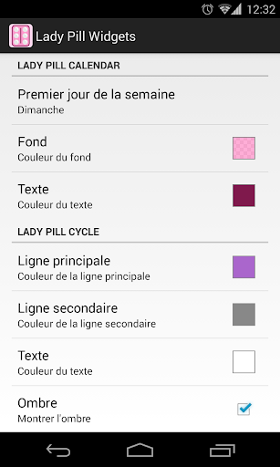 Tu peux personnaliser les couleurs de ton choix pour intégrer parfaitement les widgets sur l'écran principal de ton portable. Les widgets servent, également à accéder directement a "Lady Pill Reminder".