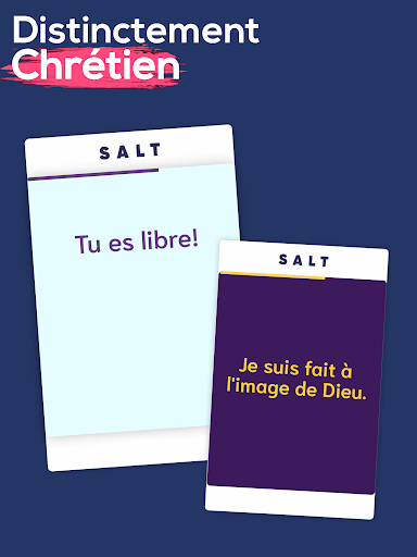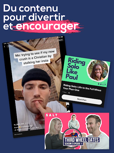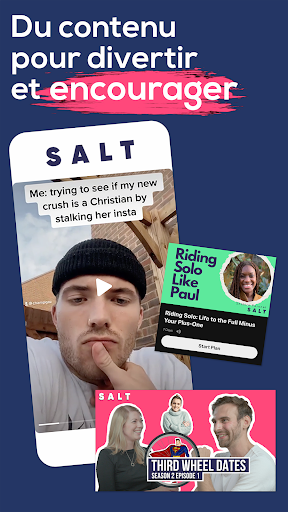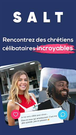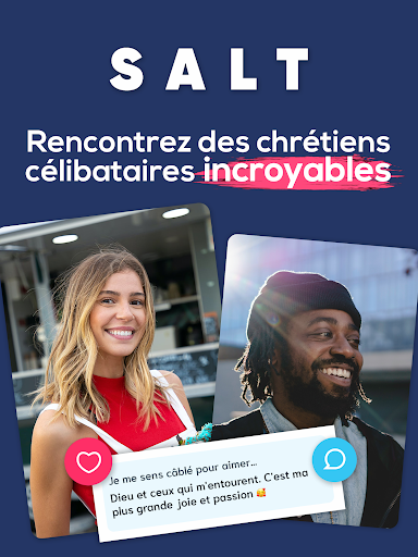 SALT est l'application de rencontre Chrétienne primée, présentée par GQ, Vogue, BBC et d'autres médias internationaux. L’application SALT est faite pour les Chrétiens par des Chrétiens. Rejoignez aujourd'hui 10,000 Chrétiens célibataires. Vous pouvez vous inscrire, rencontrer, faire des Matchs et envoyer des messages à des célibataires Chrétiens gratuitement, ou choisir de vous abonner pour bénéficier de fonctionnalités supplémentaires.