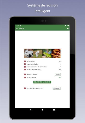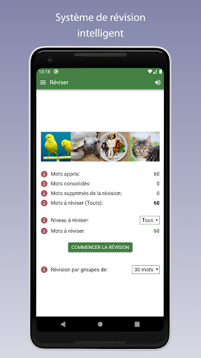 - Système de révision intelligente qui vous fera répéter les mots en fonction de vos réussites ou échecs. Plus vous échouez un mot, plus on vous le demandera jusqu’à ce que le mot soit mémorisé.
