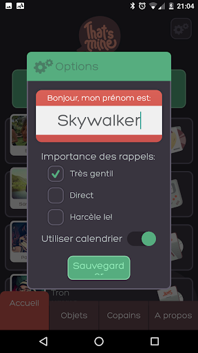 That’s mine! est une application pour savoir à qui tu as prêté des choses! Prend en note tous les trucs que tu prêtes à travers différentes catégories comme: jeux videos, livres, vêtements, argent, notes… Ainsi, tu sauras à qui demander l’objet que tu as prêté.