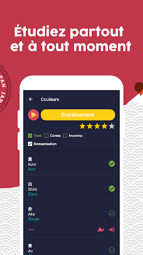 L'application propose une sélection de mots japonais absolument gratuits. Vous apprenez le japonais à partir de zéro, des bases aux mots les plus avancés.
