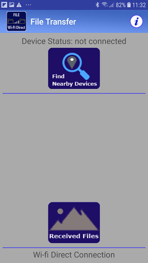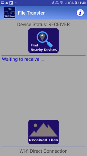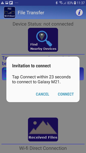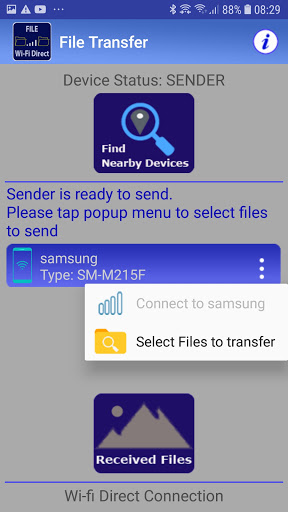 2. Lancez l'application de transfert de fichier sur les deux appareils à 3. Appuyez sur la touche "Trouver des périphériques à proximité" sur les deux appareils en même temps pour obtenir et afficher une liste d'appareils à proximité sur les deux appareils à 4. La connexion commence toujours sur le côté de l'expéditeur, mais le côté de la réception reste toujours pour accepter de se connecter avec l'expéditeur lorsque la requête de connexion vient.