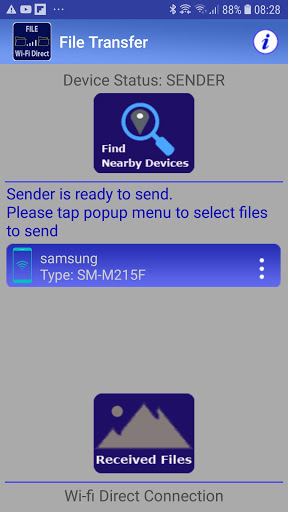 Transfert de fichiers (WiFi-Direct) App est utilisé pour transférer des fichiers entre 2 périphériques Android à l'aide de la plate-forme WiFi directe