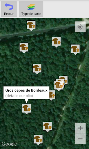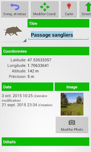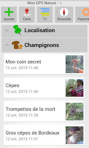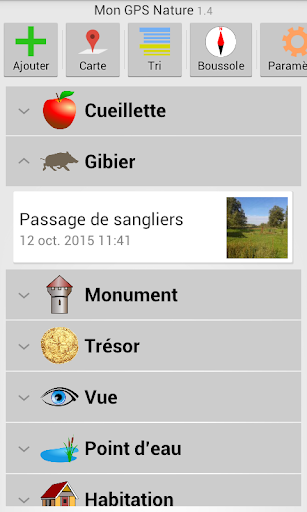 Elle vous facilite le tri des lieux en les regroupant dans des catégories adaptées : champignons, fleurs, arbre, cueillette, végétation, empreintes, gibier, pêche, monument, trésor, vue, point d'eau, habitation, animal, singularité, danger, chemin.