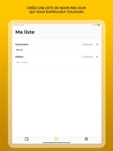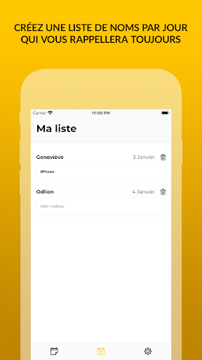 Dans Namio, vous pouvez créer une liste illimitée de jours de nom. La liste de noms a un champ spécial sous chaque nom pour entrer une idée de cadeau, vous avez donc toujours ce que vous envisagez d'acheter à portée de main.
