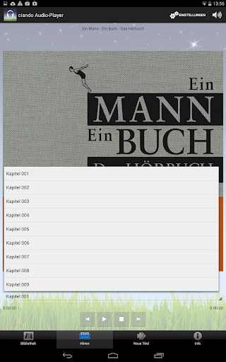 Beim „Hören“ Ihres Audiobooks können Sie von einem Kapitel in das nächste oder zurück in das vorherige Kapitel wechseln. Sie können sich auch eine Gesamtübersicht aller Kapitel anzeigen lassen, indem Sie auf das Wort ‚Kapitel‘ tippen. Die Lautstärke lässt sich ebenfalls bequem über das Lautsprecher-Icon regulieren. Beim Tippen auf das Cover erhalten Sie die Metadaten (Autor, Verlag, Erscheinungsjahr, Gesamtgröße, Format usw.) zum entsprechenden Audiobook.