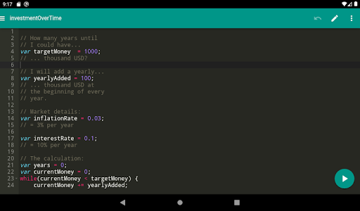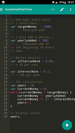 Code est un coureur de code vraiment simple, mais puissant pour vos calculs quotidiens. Vous pouvez l'utiliser comme calculatrice de tâches vraiment complexes (par exemple, calculer les flux de trésorerie liés à votre prêt hypothécaire, à votre prêt auto et à votre prêt étudiant combiné, ou par mois au cours des 12 prochaines années, les taux d'intérêt inclus). Il affichera, sauvera et colorera la formule pour une meilleure compréhension et des visionnements futurs. Donné, vous savez JavaScript ...