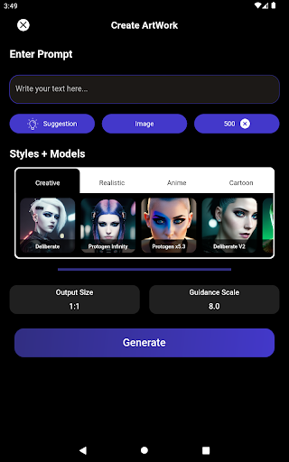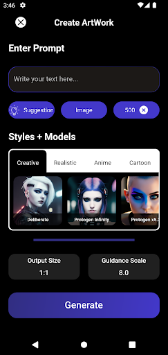 2: Invite d'entrée, sélectionnez Style / modèle et choisissez une taille ouput ce que vous souhaitez créer et sélectionner générer.Le générateur d'image AI créera l'art AI pour vous.