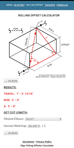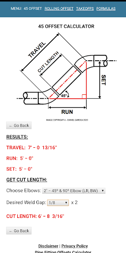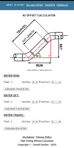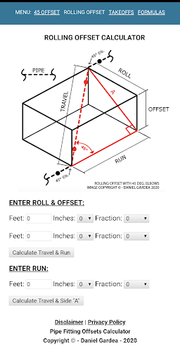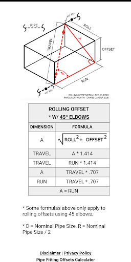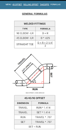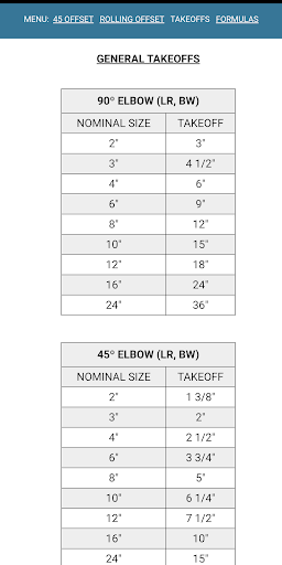 'Pipe Fitting Offsets Calculator' is a practical pipe fitting app that makes it easy to calculate the TRAVEL, RUN, SET, 45 Offsets, and even Rolling Offsets using user provided dimensions in feet and inches. This app also provides general welded pipe fitting takeoffs along with their formulas and information on how to get the 45 Offset and Rolling Offset dimensions.