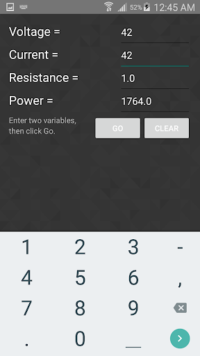 Enter any two of the variables (Voltage, Current, Resistance, and Power) then press enter on your keyboard, or touch the built-in Go button. The other values will be calculated for you!