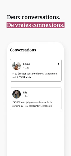 Alors que les apps de dating actuelles veulent que vous collectionnez toujours plus de matchs, notre objectif est de vous matcher avec les bonnes personnes afin que vous puissiez entretenir des conversations intéressantes qui forment de vraies connexions. Pour cette raison, nous limitons à deux le nombre de conversations qu'un utilisateur peut avoir en même temps.