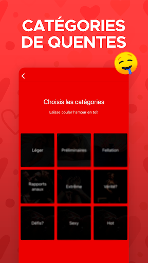 Ce jeu 18 pour les couples, comporte plus de 1500 défis, divisés en 5 Catégories, qui rendront l'atmosphère chaude, de douce à extrême, selon vos souhaits. Et en plus, c'est le seul à proposer des avatars pour rendre les choses encore plus intéressantes.