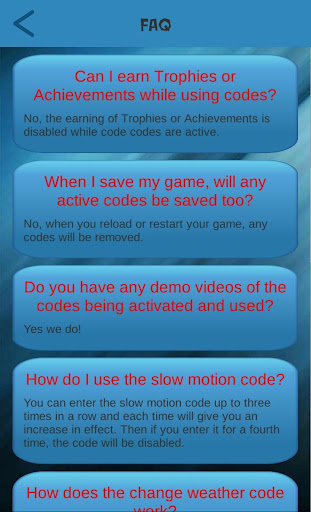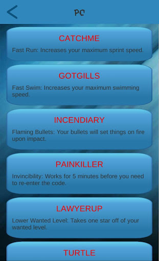 Les codes eux-mêmes sont divisés en cinq catégories différentes (effets du joueur, effets de combat, codes d'articles, effets mondiaux et en frappe des véhicules) et peut être activé en utilisant soit: la méthode combinée de bouton de contrôleur traditionnel (fonctionne sur toutes les versions de console); en entrant un code spécifique à l'aide de votre clavier; ou en composant certains nombres en utilisant le téléphone portable dans le jeu.