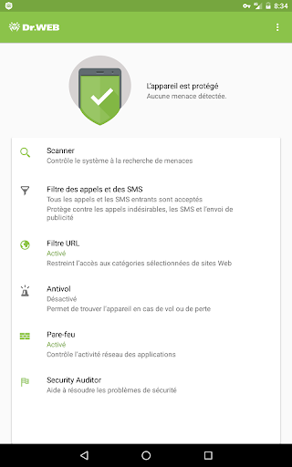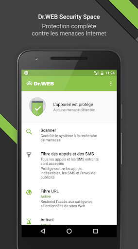 Le jeu de composants de Dr.Web Security Space comprend uniquement les composants Dr.Web correspondant à la politique de Google en vigueur et il peut être modifié à tout moment par le titulaire des droits d'auteur sur le logiciel (l’éditeur) afin d'assurer la conformité à cette politique. Dr.Web Security Space pour Android avec un ensemble complet de composants, y compris le filtre des appels et des SMS et Antivol, est disponible sur le site Web de l’éditeur.