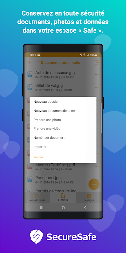 • Coffre-fort fichiers : Stocker et éditer tous vos fichiers importants dans votre coffre-fort numérique et y accéder partout, à tout moment.