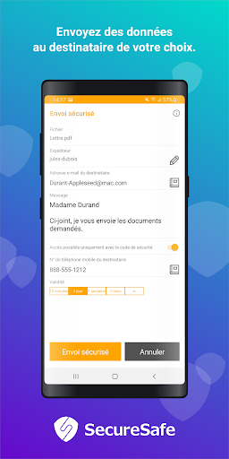 • SecureSend : Grâce à SecureSend, vous pouvez crypter et envoyer jusqu'à 2 Go de fichiers volumineux à n’importe quel destinataire de votre choix (le destinataire n'a pas besoin SecureSafe pour télécharger le fichier).