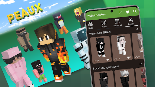 Build Master for Minecraft PE est un lanceur d'utilitaires gratuit à travers lequel vous pouvez installer rapidement et facilement de nouveaux addons populaires, de nouvelles cartes, bâtiments, textures, et dans le Build Master, vous trouverez une collection incroyablement large de skins. Téléchargez et installez automatiquement dans le jeu via notre lanceur :