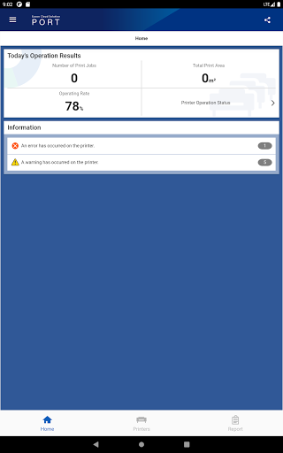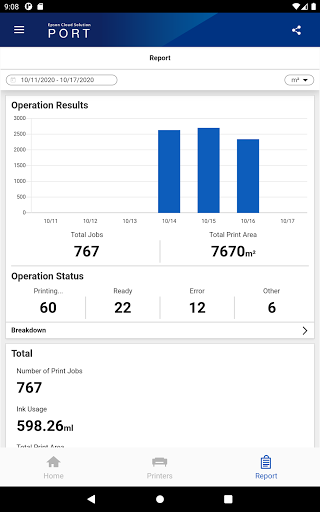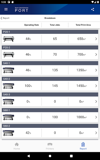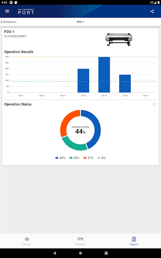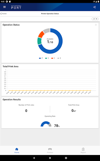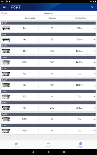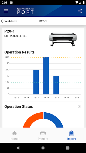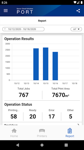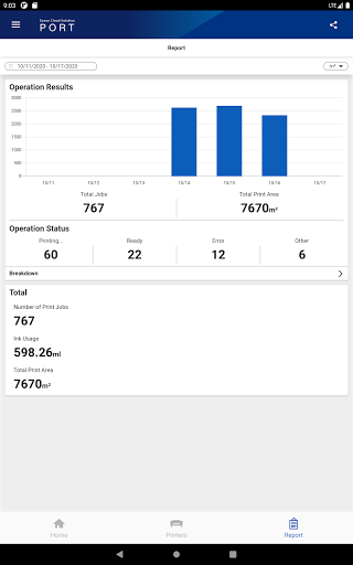 Vous pouvez savoir le nombre de travaux d'impression, la surface imprimée, le taux de fonctionnement des imprimantes et également les erreurs détectées en temps réel. La fonction « Rapport » peut résumer ces données pour une période donnée et les afficher sous forme de graphique, et vous pouvez également afficher la répartition par imprimante.