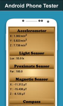 Every android phone has builtin Accelerator, gyroscope, compass, proximity sensor, pressure sensor. Phone tester gives you all information and values of these sensors in detail.