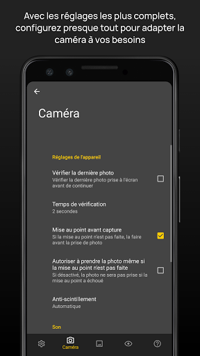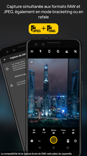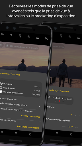 ● Mode de bracketing automatique de l'exposition: jusqu'à 9 photos avec un espacement d'exposition personnalisé. Prend désormais en charge la capture instantanée, même avec JPEG DNG, sur des milliers d'appareils.