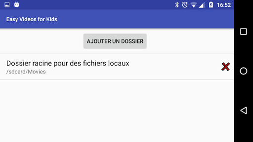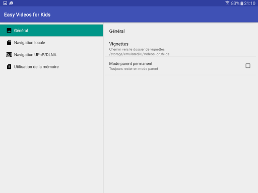 Il faut simplement configurer le dossier local où sont les vidéos et/ou l'emplacement de ces films sur votre serveur multimédia UPnp DLNA, et laisser les enfants jouer avec l'application. Ils peuvent naviguer entre les dossiers mais jamais sortir de ceux qui ont été définis comme racine.