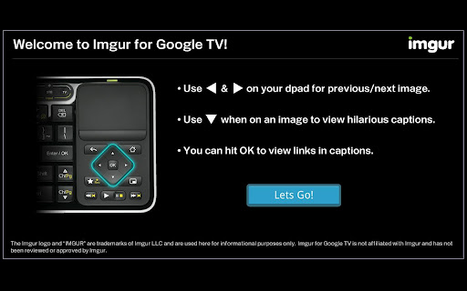 google TVoptimized Imgur photo browser that supports animated GIFs amp; captions.NOTE: Requires GTV and keyboard with a DPAD.Simple and effective Imgur photo browser for Google TV.Dpad leftright to browse the images amp; dpad down to read the captions. You can click on captions with links to launch them in Chrome.NOTE: This app displays the latest images from imgur.com, and may include some racy content EnjoyThe Imgur logo and IMGUR are trademarks of Imgur LLC and are used here for informational purposes only.Imgur for Google TV is not affiliated with Imgur and has not been reviewed or approved by Imgur.