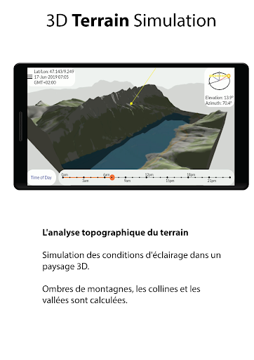 ★Le simulateur de terrain 3D simule les conditions de lumière dans un paysage 3D au cours d'une journée et d'une année et calcule les ombres des montagnes, des collines et des vallées