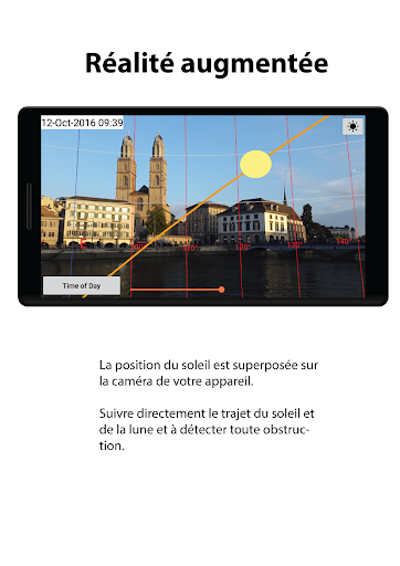 ★La vue caméra montre la fonctionnalité RA (réalité augmentée) de Sun Locator. La position du soleil et de la lune est superposée sur la caméra de votre appareil. Elle vous aide à suivre directement le trajet du soleil et de la lune et à détecter toute obstruction.