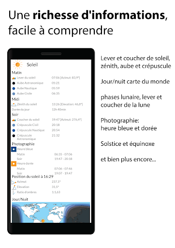 ★La vue principale affiche les données importantes sur la position actuelle du soleil et de la lune, telles que le coucher et le lever du soleil, le crépuscule, la phase de la lune, etc.