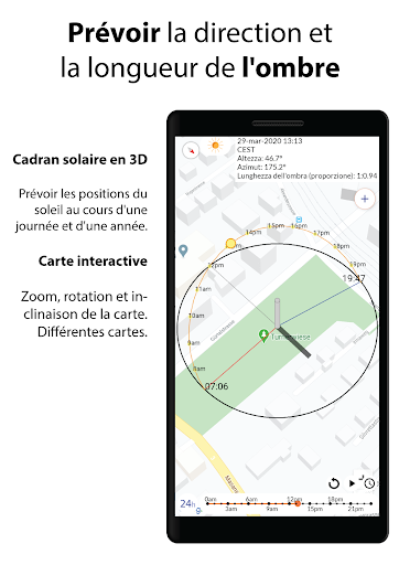 ★La vue cartographique montre le chemin du soleil et de la lune superposé sur Google Maps et l'ombre est affichée sur un cadran solaire en 3D.