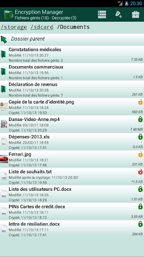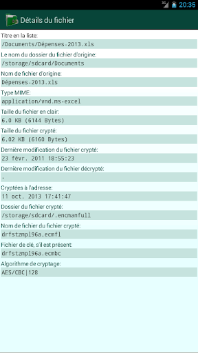 Fichiers confidentiels sont accessibles directement après le login. Avec un clic sur le fichier, le fichier est décrypté à son emplacement d'origine et peut être affiché par le spectateur installé. Lorsque vous avez fini de travailler avec la copie décryptée, le fichier est chiffré de nouveau en un seul clic et le fichier décrypté est rayé de la carte SD. Ce processus d'effacement écraser les données avec des octets aléatoires avant que le fichier est supprimé. Donc, même si l'appareil est perdu ou volé, il n'est pas possible d'accéder à vos données confidentielles. Cryptage de fichiers nouveaux est très simple: ils peuvent être choisis soit avec le gestionnaire de fichiers intégré ou en utilisant simplement "envoyer / partager" d'un autre application.
