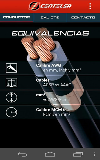 Aplicación básica para los estudiantes y técnicos electricistas que desean conocer información básica de los conductores eléctricos. Esta APP cuenta con tres pestañas principales: CONDUCTOR – CAL CTE – CONTACTO.