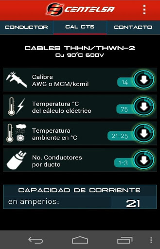 La pestaña CAL CTE reemplaza la tradicional tabla de capacidad de corriente de los cables THHN/THWN, que CENTELSA ofrece a sus usuarios.
