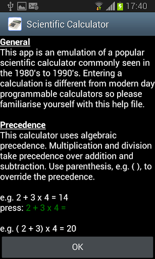 The calculator uses algebraic precedence and instructions on further data entry is available in the app.