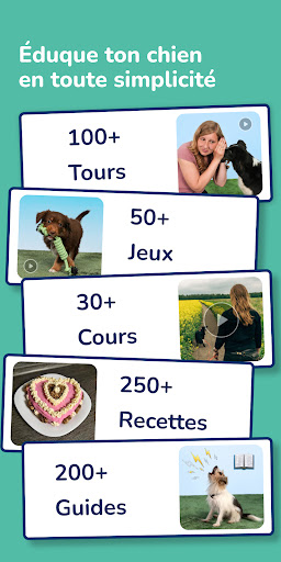 Découvre un large éventail de tours, de jeux et de recettes pour chiens. Trouve l'inspiration pour ta prochaine séance de dressage et amusez-vous ensemble. Dans cette application, tu trouvera par exemple les cours suivants : Commandes de base, Notions de base sur les chiots (promener le chiot, apprentissage de la propreté à la maison, inhibition de la morsure, alimentation du chiot, jeux pour chiots, commandes pour chiots), Apprentissage de la laisse, Cours de maître sur le rappel, Comment ignorer les autres chiens en promenade, Comment se comporter lors d'une visite, Cours de clicker, Guide sur le contrôle des impulsions chez le chien, Bilan de santé à la maison, Alimentation crue, Entraîneur à la muselière, Calme au bureau, Entraînement pour le réveillon, Empêcher votre chien de manger des choses au hasard, Entraîneur à l'arrêt des aboiements ou Cours de maintien de la solitude pour chiens.