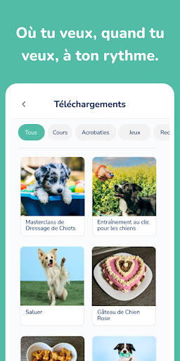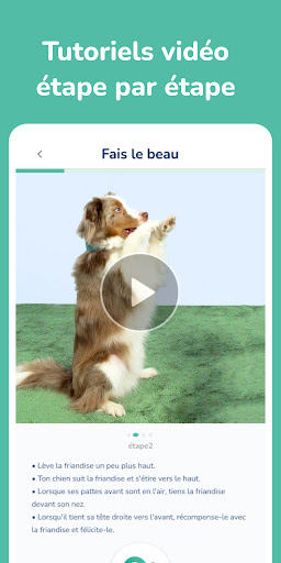 Nous te guidons vers ton objectif grâce à nos didacticiels vidéo interactifs. Les tutoriels sont conçus pour que tu puisses réussir avec seulement 5 minutes d'entraînement par jour. Ils te rappellent ton entraînement et lorsque tu réussis, tu obtiens un superbe trophée pour ta boîte à trophées virtuelle. Outre les méthodes de dressage des chiens, tu trouveras également des activités intéressantes sous la forme de jeux et de recettes pour animaux de compagnie.