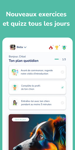 Chaque jour, des quiz gratuits, des astuces, des jeux, des recettes et des cours soigneusement sélectionnés pour toi. Adaptés à toi et à ta race de chien. (Nous avons 285 races de chiens comme le Labrador, le Bouledogue français, le Carlin, le Doberman, le Chihuahua).