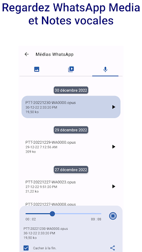NoBlueTick n'accède à aucun fichier crypté. Toutes les données sont stockées en toute sécurité sur votre appareil.