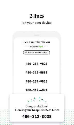 With the Keap app, keep your personal and work communication separate with a second phone number for business for your Android phone. Your 2nd line comes with unlimited business calls and text messages and your existing cell number stays private. No need to change phone numbers! You can also use the app as a phone number generator to easily secure a personalized number that’s perfect for your business.