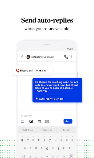 Auto replies when you’re away. Automatically send a text message from your business side line with auto-replies when you miss a call so you never miss out on following up with a lead or an important client.