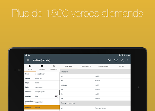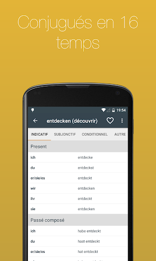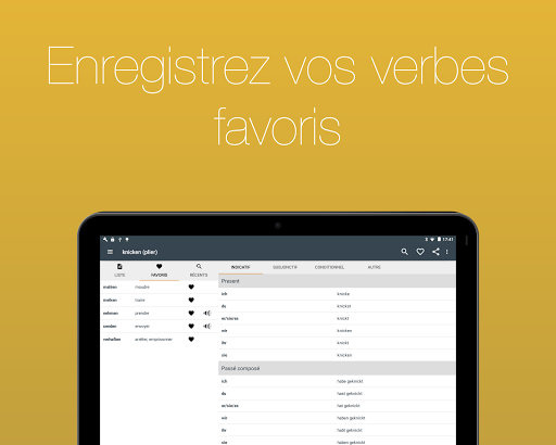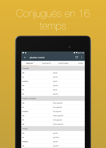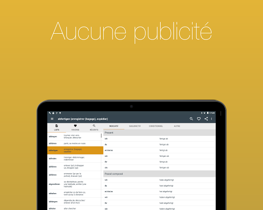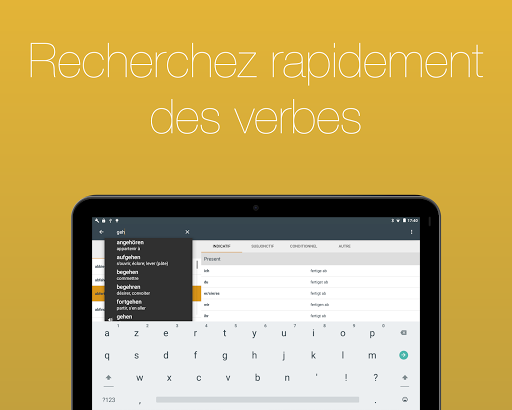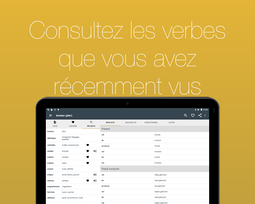 Consultez pas moins 700 verbes français conjugués à 17 temps. Grâce à une navigation simple et une fonction de recherche intégrée, vous pouvez trouver le verbe dont vous avez besoin en quelques secondes.