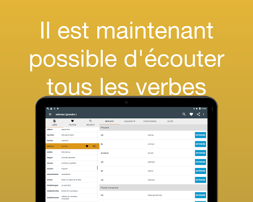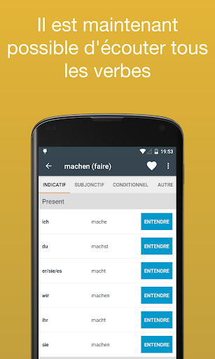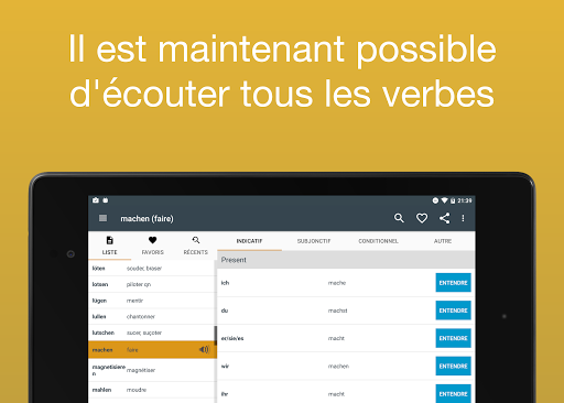 Maintenant, avec l'audio! Vous ne savez pas comment prononcer un verbe? Vous pouvez maintenant écouter la prononciation de chaque verbe. Il suffit de taper sur le bouton à côté de la conjugaison. Remarque: cette fonctionnalité nécessite une connexion Internet.