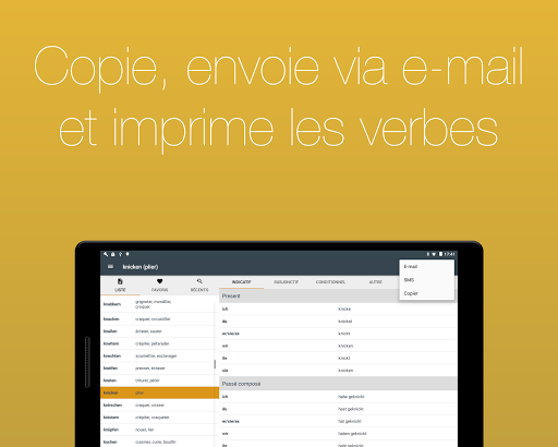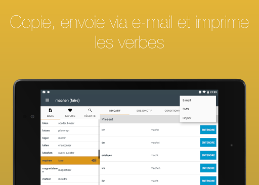Inclut la possibilité de copier, envoyer par courriel et imprimer la conjugaison des verbes.