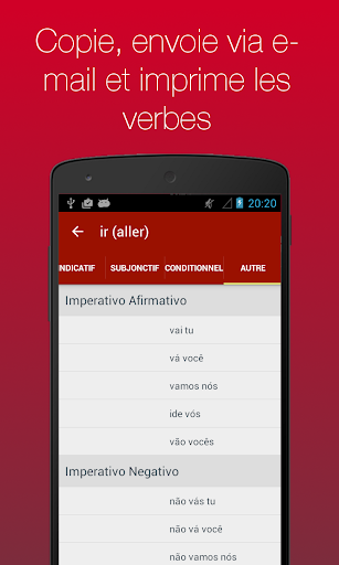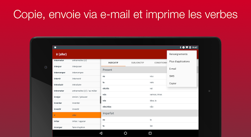 ● Inclut la possibilité de copier des conjugaisons verbales et de les envoyer par e-mail ou sms.