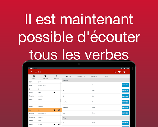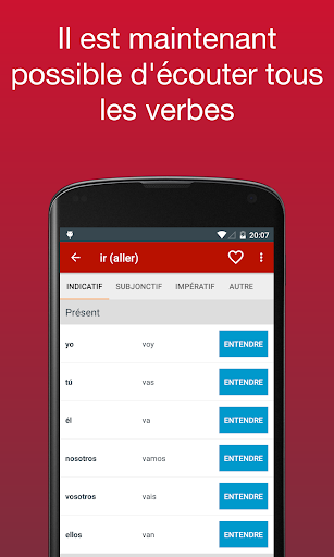 Maintenant, avec l'audio! Vous ne savez pas comment prononcer un verbe? Vous pouvez maintenant écouter la prononciation de chaque verbe. Il suffit de taper sur le bouton à côté de la conjugaison. Remarque: cette fonctionnalité nécessite une connexion Internet.