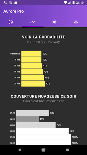 - Prévisions pour la prochaine heure, plusieurs heures et plusieurs semaines afin que vous puissiez organiser vos observations d’aurores boréales longtemps à l’avance (sous réserve des conditions météorologiques).