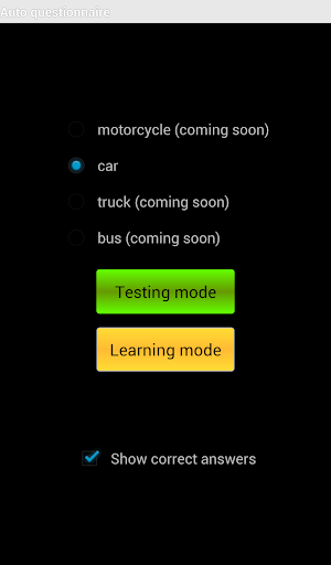 Auto questionnaires (driver license practice test) for: - motorcycle (coming soon) - car - truck (coming soon) - bus (coming soon) Language: English