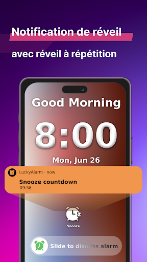 Téléchargez 'LuckyAlarm Alarm Clock: Colorful Wake' aujourd'hui et révolutionnez vos matins avec inspiration, fortune et musique !